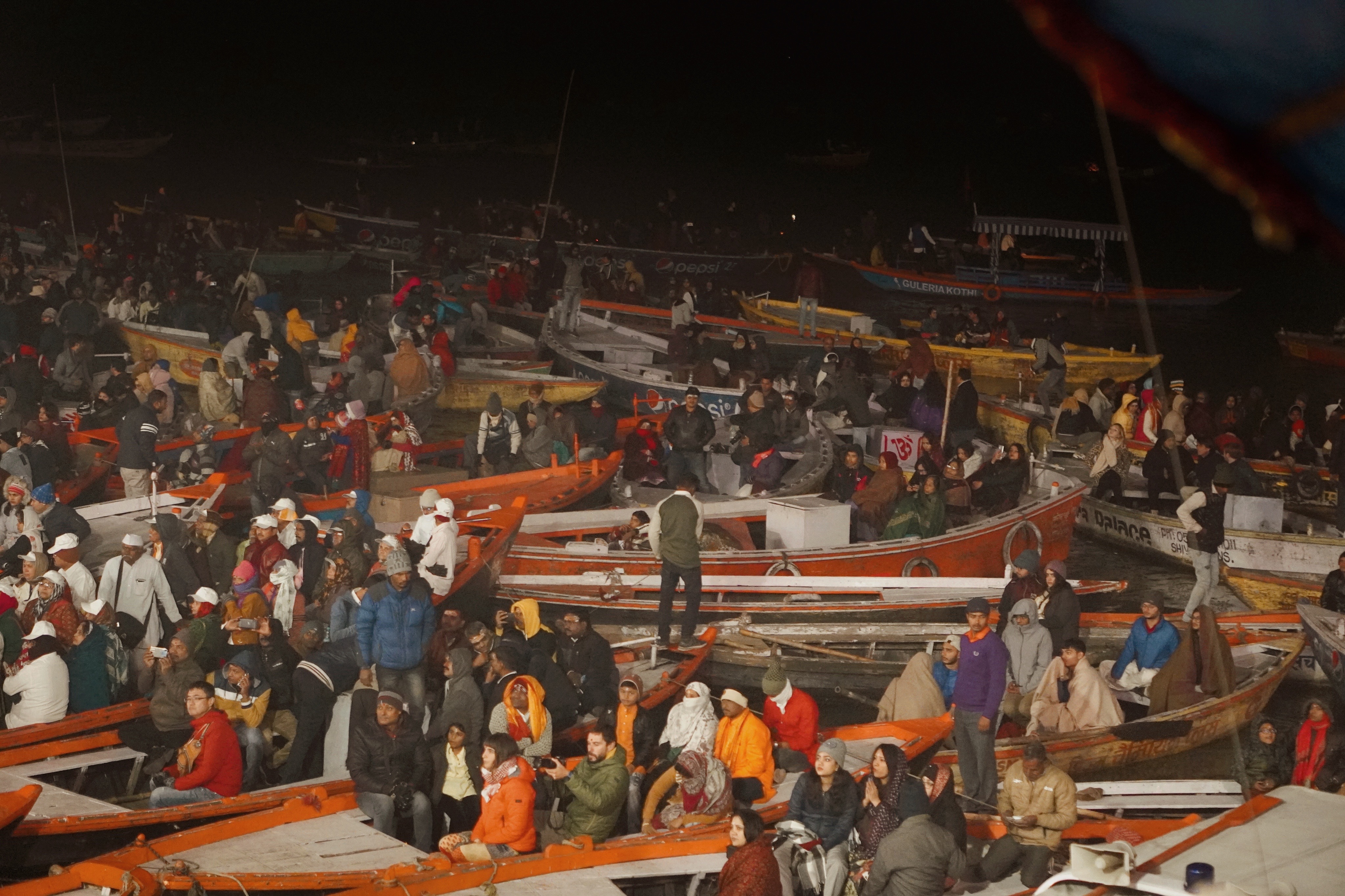 ボートの上からプージャを見る人たちガート周辺は、船の上も陸上もプージャを見る人たちでギュウギュウに……!